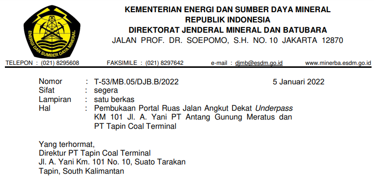 Surat tertanggal 5 Januari 2022 ditujukan kepada Direktur PT Tapin Coal Terminal