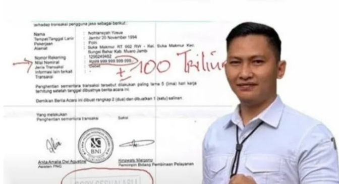 Dalam video yang diunggah akun instagram @lambe_turah memperlihatkan bukti debit uang 100 triliun atas nama Novriansyah Yosua.