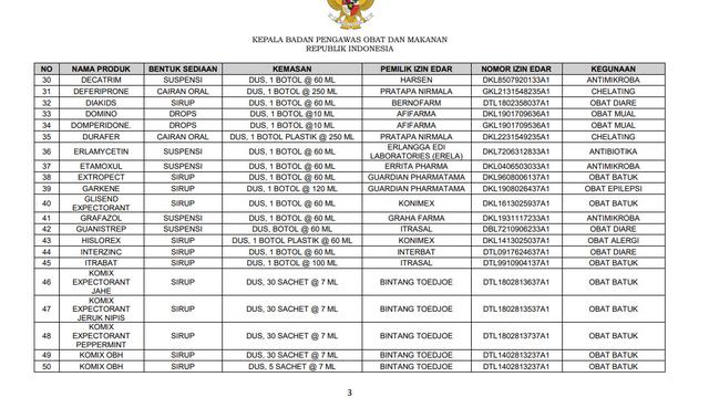 Di sisi lain, BPOM juga merilis daftar obat yang aman digunakan sesuai dengan hasil verifikasi pelaksanaan pengujian bahan baku.
