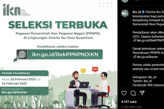 “Dalam rangka penerimaan Pegawai Pemerintah Non Pegawai Negeri (PPNPN) di lingkungan Otorita Ibu Kota Nusantara, maka Otorita Ibu Kota Nusantara akan melaksanakan seleksi terbuka,” bunyi pengumuman yang diterima Kompas.com, Sabtu (18/2/2023).