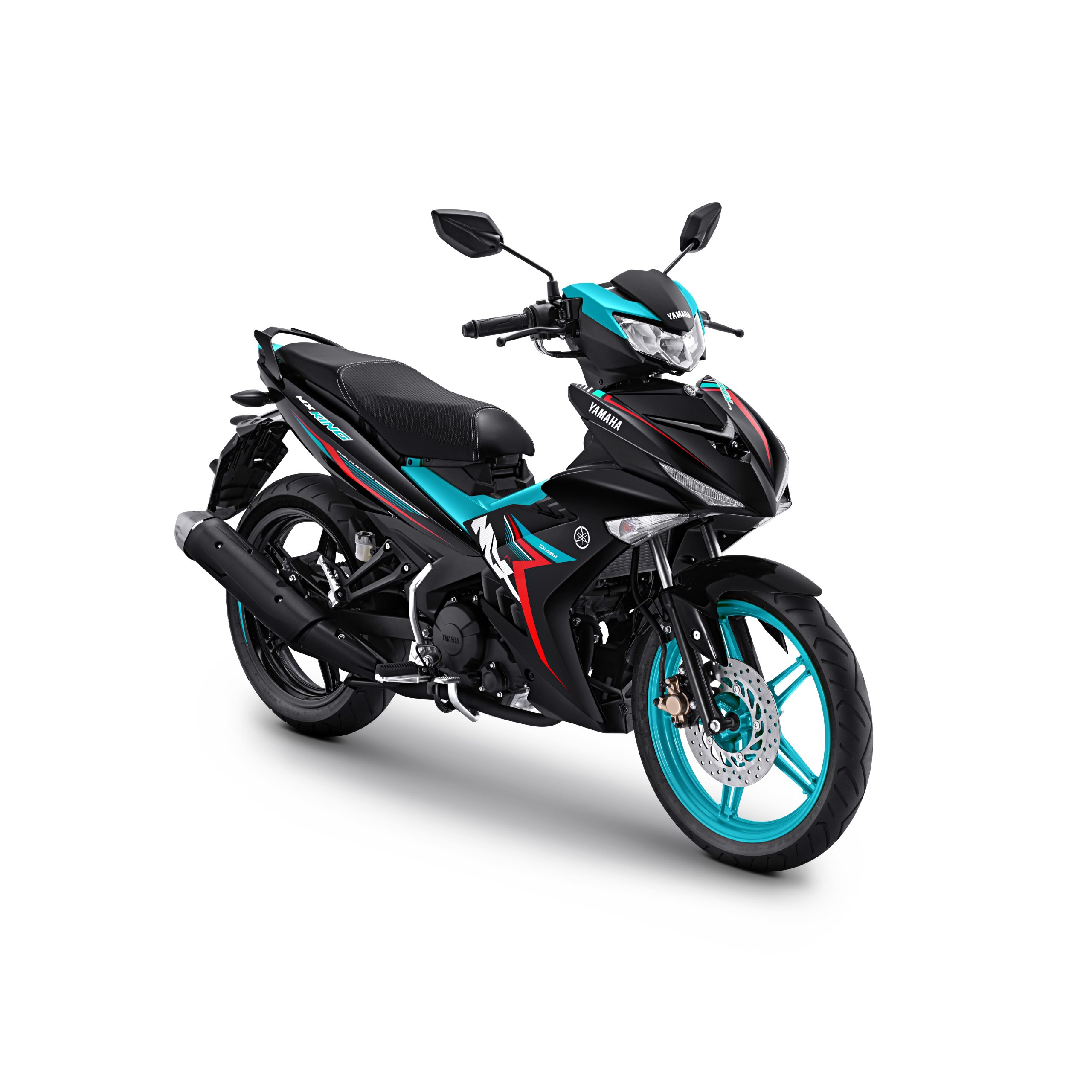 Yamaha MX King 150 Cyan juga memiliki kombinasi warna hitam serta grafis merah dan putih. Velg depan motor ini juga dipoles warna cyan dan velg belakang hitam sehingga ikut mengangkat kombinasi kedua warna itu pada Yamaha MX King 150 Cyan.