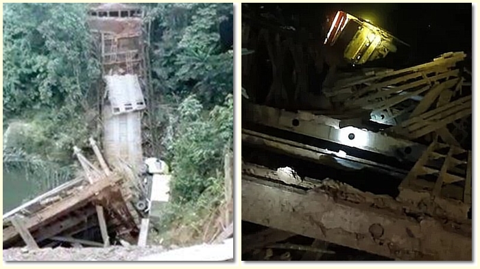 Petaka Jembatan Kumap, karena tak mampu menahan beban sebuah truk, Rabu (2/8/2023). Truk dan sejumlah awaknya terjun bebas.