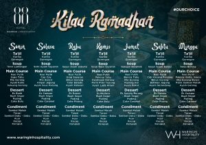 Sajian berupa ta’jil, makanan utama hingga makanan penutup khas Nusantara. Seperti ayam saus padang, ayam lada hitam, kwetiaw, mie bancir.