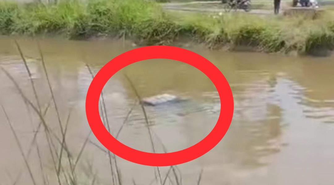 Mobil tercebur ke sungai hampir menutupi seluruh badan mobil. Hanya bagian atap mobil yang terlihat.