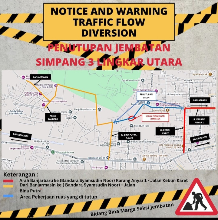– Sebaliknya, dari arah bandara Syamsudin Noor menuju Jalan Karang Anyar 1 (Banjarbaru) akan dialihkan menuju Jalan Bina Putra