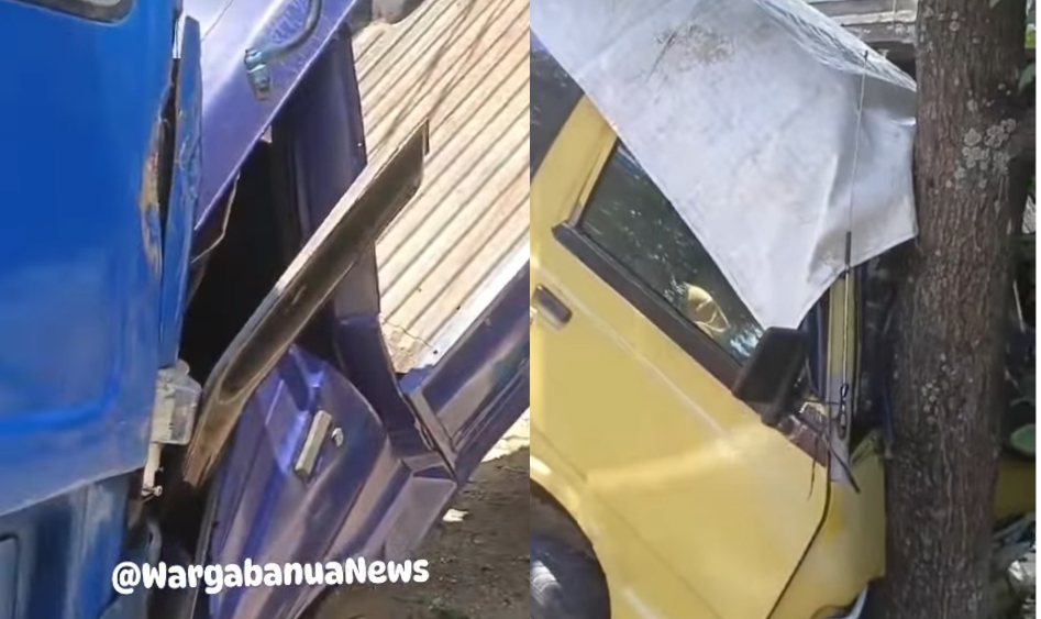 Bagian depan pikap ringsek. Di belakang pikap terdapat belakang angkot yang bagian depannya menabrak pohon.