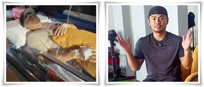 Dalam unggahan Revti Ayu Natasha, terlihat bapak tiga anak itu berbaring dengan mata terpejam dan selang infus terpasang di tangannya.