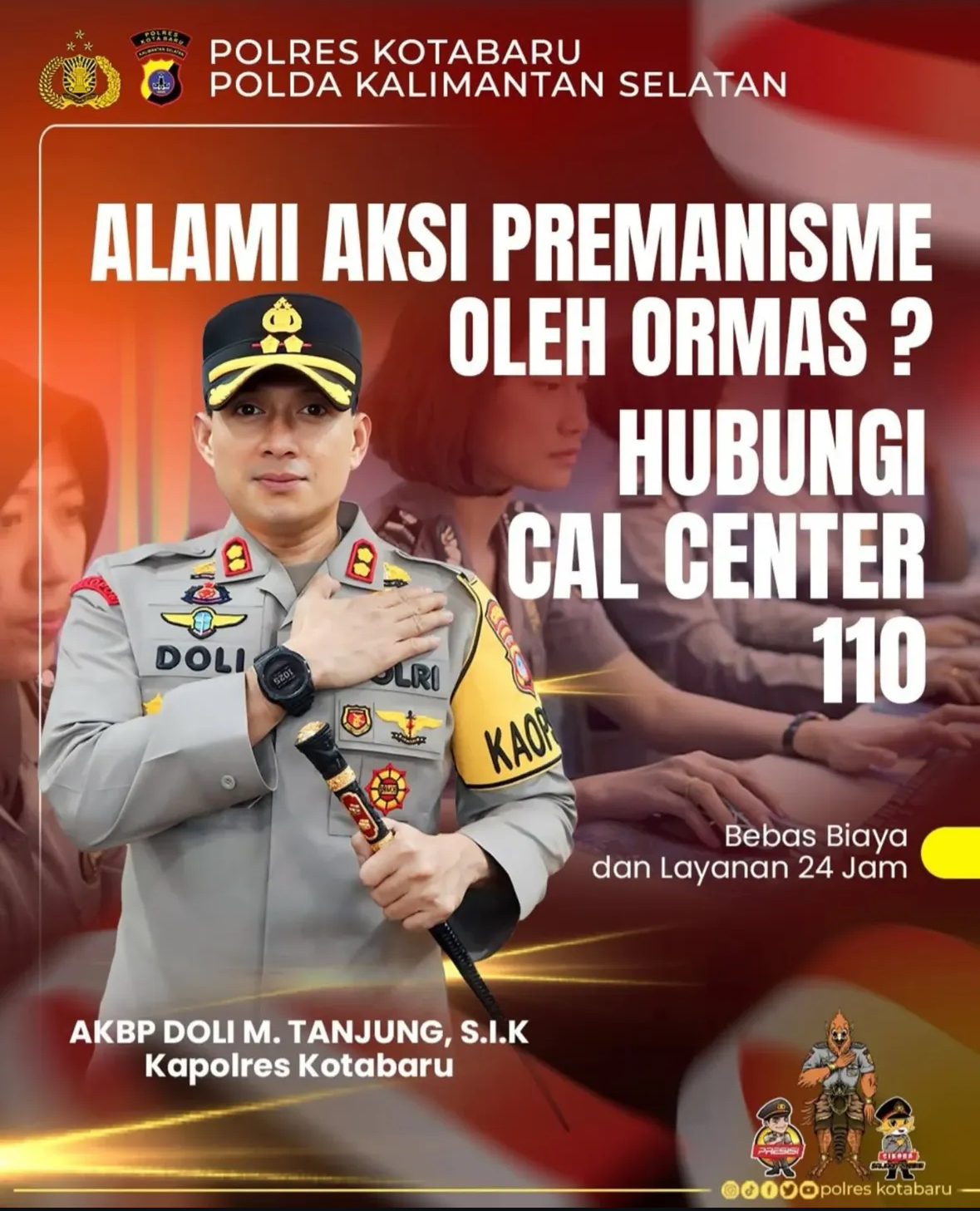 Kapolres Kotabaru, AKBP Doli M. Tanjung, S.I.K., dikutip dari situs Polres Kotabaru, Jumat (16/5/2025) mengimbau warga, khususnya di Kabupaten Kotabaru agar segera melapor ke Kepolisian terdekat jika ada melihat atau menemukan aksi premanisme seperti itu di lingkungan sekitar.