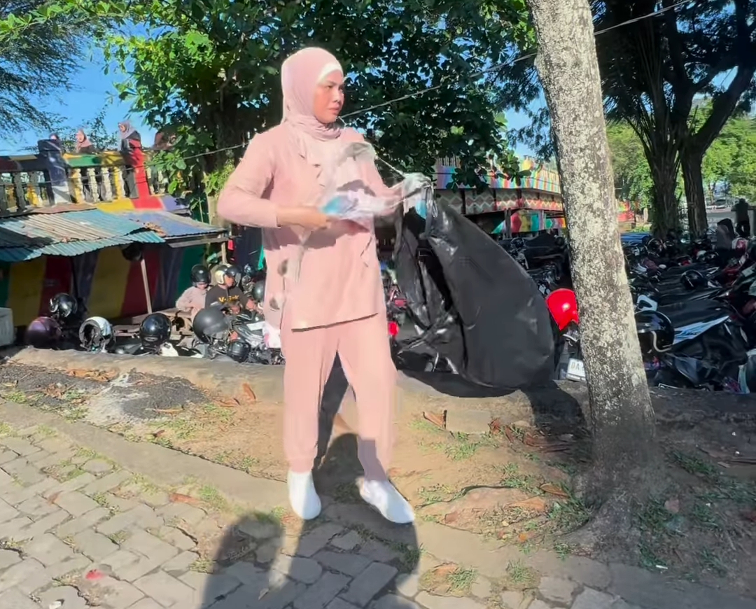 Berbekal sampah plastik hitam, ia pun akhirnya memunguti sampah yang ada di sepanjang siring.