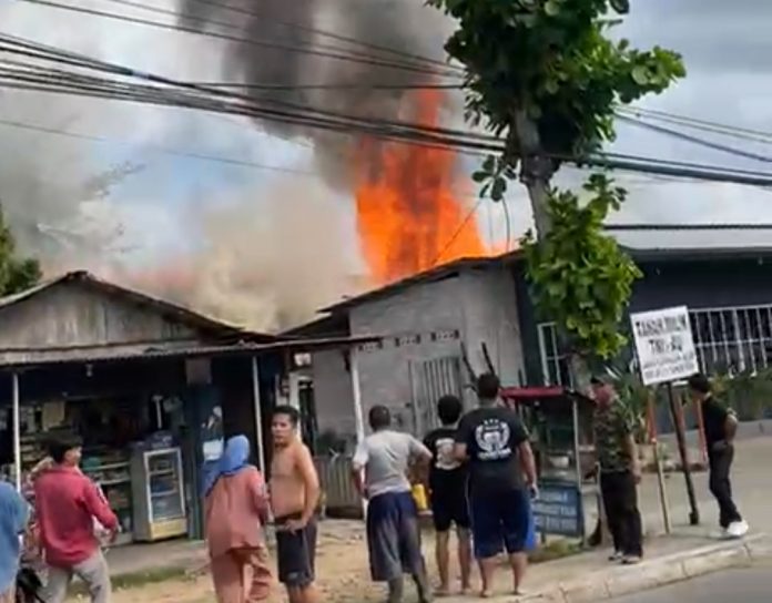 Api membakar bangunan di pinggir SPBU atau tepat di belakang rumah makan Tahu Sumedang Loktabat.