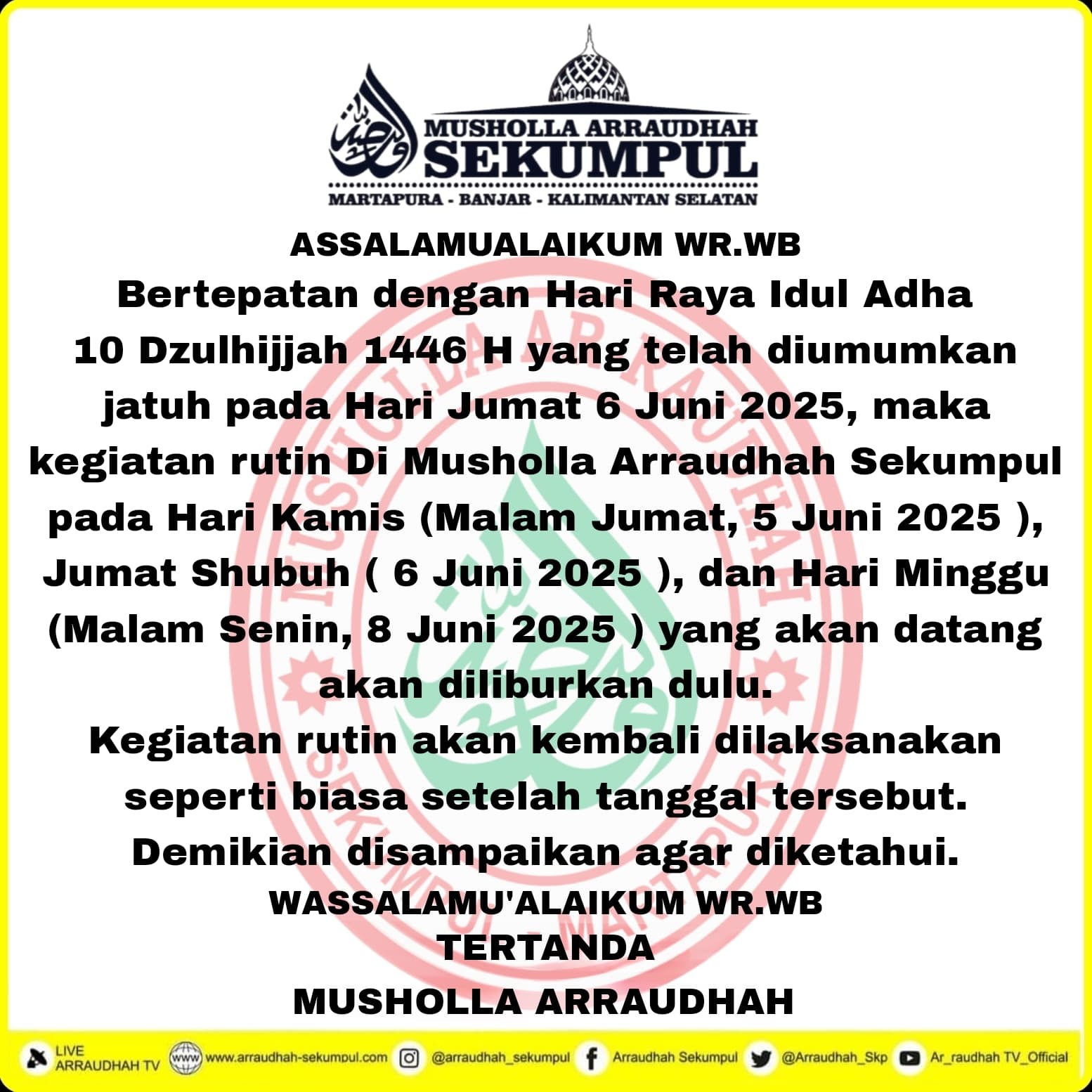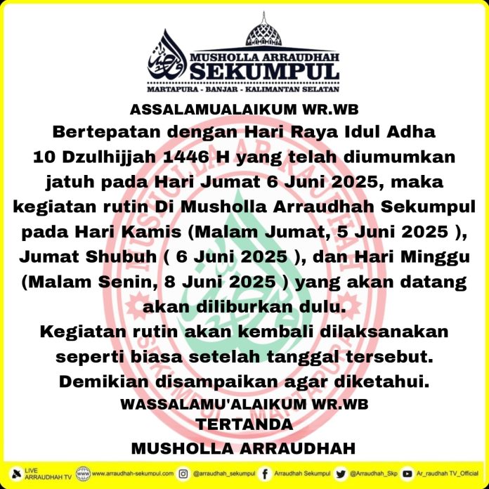 WARTABANJAR.COM, MARTAPURA – Mushola Arraudhah mengumumkan kegiatan rutin pada Kamis, 5 Juni 2025 malam diliburkan.