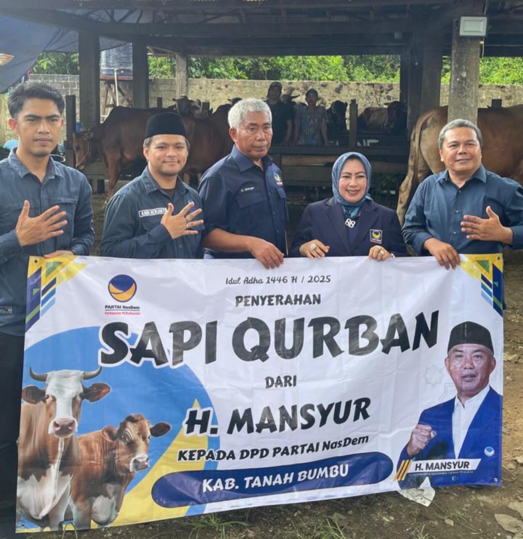 “Kami menerima lima ekor sapi kurban dari H. Mansyur. Hewan kurban ini akan kami bagikan langsung kepada masyarakat yang membutuhkan. Setiap tahun, DPW Nasdem Kalsel rutin menyalurkan bantuan seperti ini, dan kami siap menyalurkan dengan penuh amanah,” kata Erwin, Selasa (3/6/25).