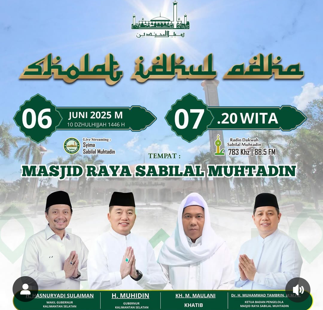 Dalam unggahan akun resmi Masjid Raya Sabilal Muhtadin, salat Idul Adha dimulai pukul 07.20 WITA.