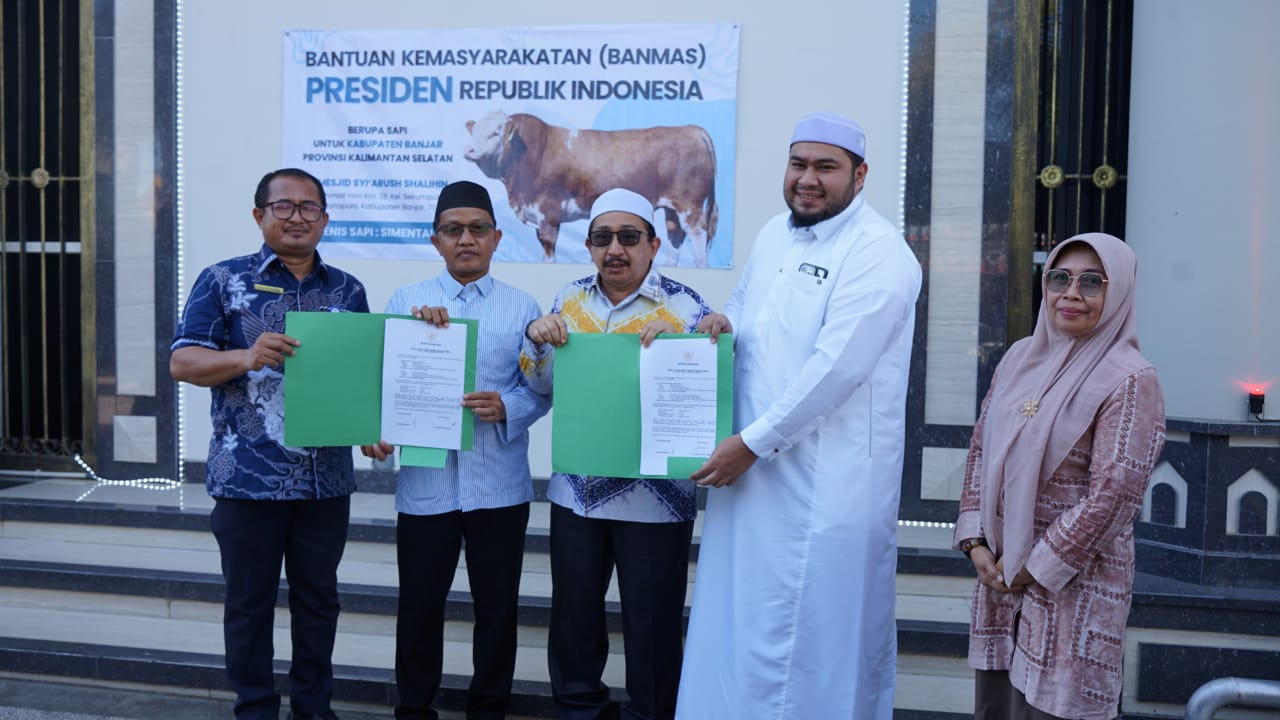 WARTABANJAR.COM, MARTAPURA- Menyambut Hari Raya Iduladha 1446 H, Pemerintah Kabupaten Banjar menyerahkan Bantuan Kemasyarakatan (Banmas) Presiden RI, Prabowo Subianto, berupa 2 ekor sapi jenis simental (875 kg) dan Limousine (920 kg) ke Masjid Syi’arush Shalihin, Sekumpul, Martapura dan Pondok Pesantren Ahbab Thoha, Kamis (6/5/2025) pagi.