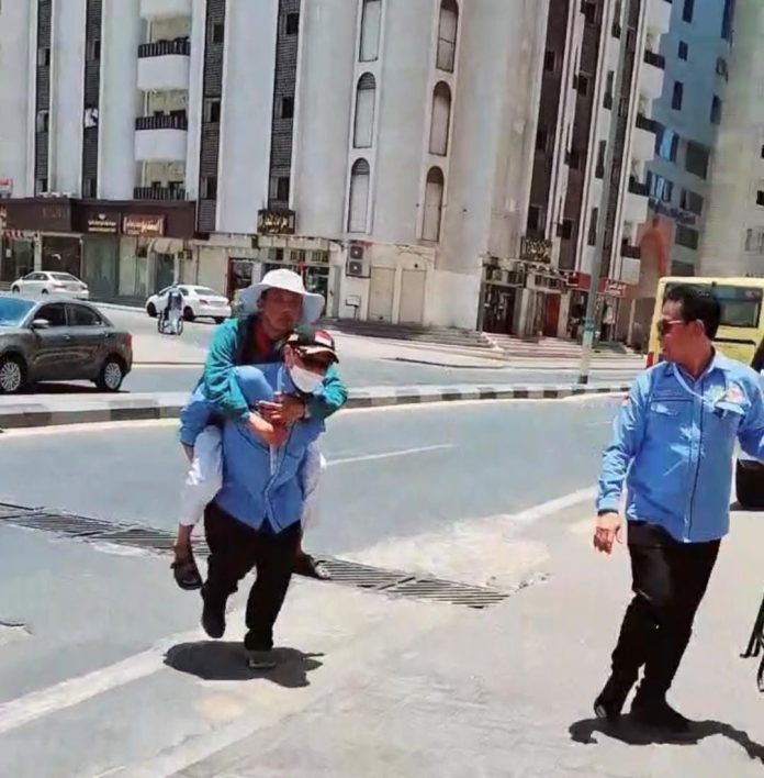 Di pelukannya, seorang jamaah lanjut usia yang lemah tak berdaya karena stroke, kebingungan setelah diturunkan di hotel yang bukan tempatnya menginap.