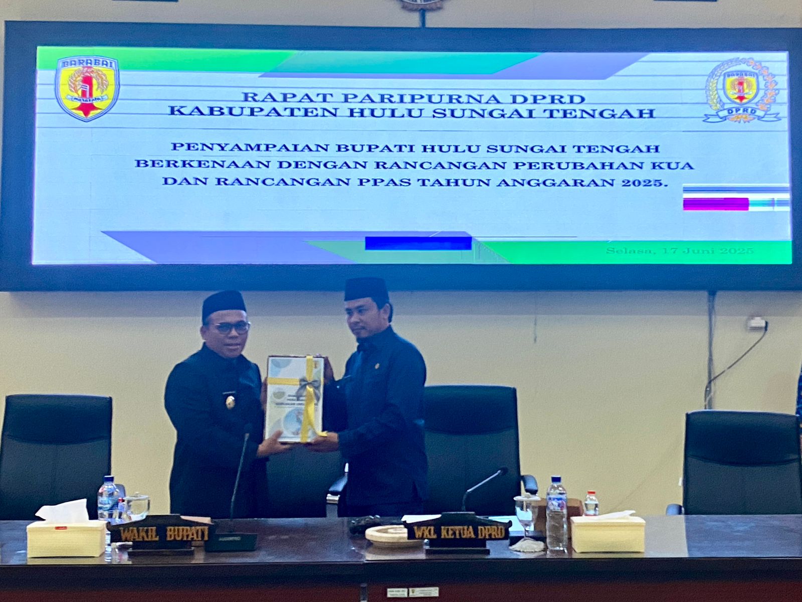 WARTABANJAR.COM, BARABAI – Wakil Bupati Hulu Sungai Tengah (HST), Gusti Rosyadi Elmi, menyampaikan Rancangan Perubahan Kebijakan Umum APBD (KUA) dan Prioritas dan Plafon Anggaran Sementara (PPAS) Tahun Anggaran 2025 dalam Rapat Paripurna DPRD HST, Selasa (17/6/2025).