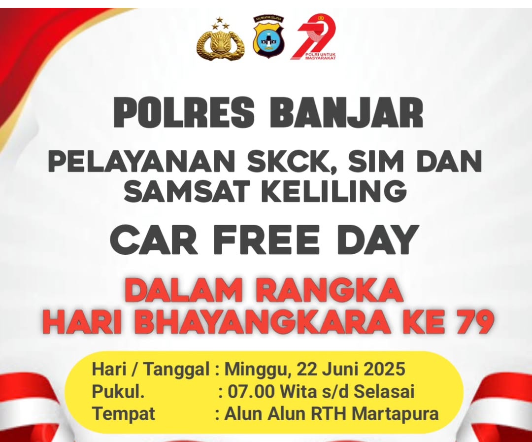 WARTABANJAR.COM, MARTAPURA – Polres Banjar akan mengadakan berbagai pelayanan saat Car Free Day di Alun Alun RTH Martapura pada Minggu, 22 Juni 2025.