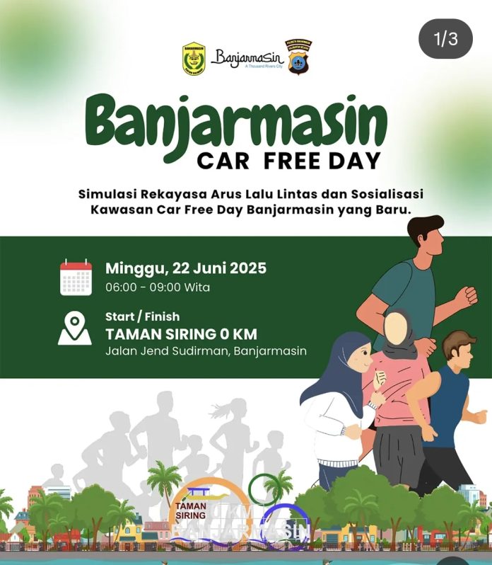 WARTABANJAR.COM, BANJARMASIN – Car Free Day (CFD) di Kawasan Taman Siring 0 Kilometer, akan digelar pada Minggu, 22 Juni 2025.