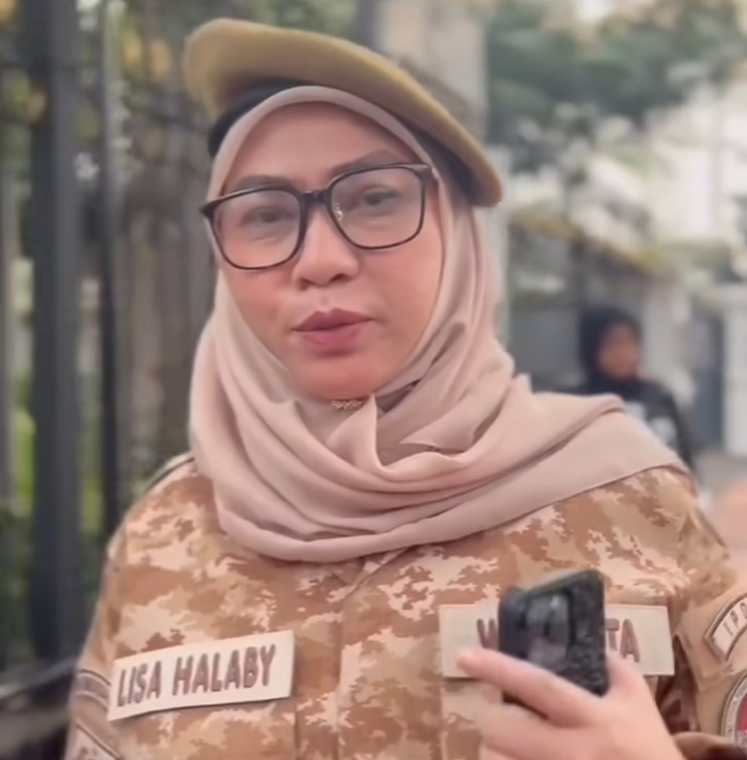 Ia mengenakan pakaian loreng coklat dilengkapi dengan topi.