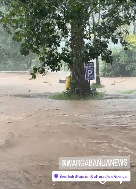 Ketinggian banjir tampak cukup dalam sehingga merendam pepohonan juga.