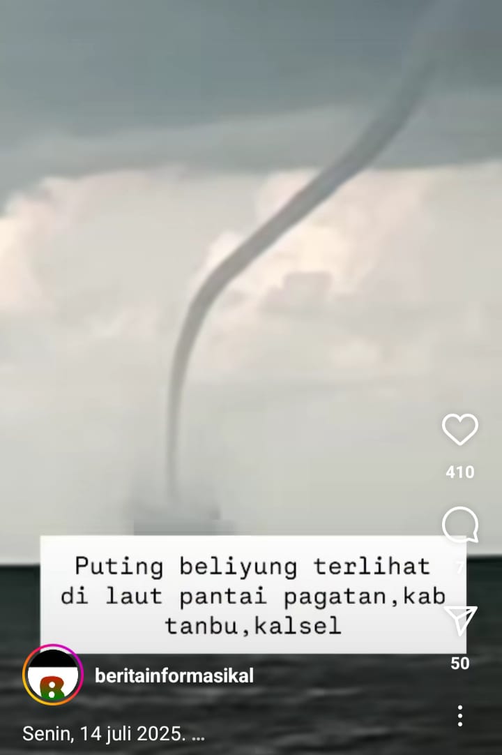 “Info nah puting beliung di daerah Kusan Hilir lumayan gede,” ujarnya, seperti dilaporkan oleh akun Instagram @beritainformasikal.