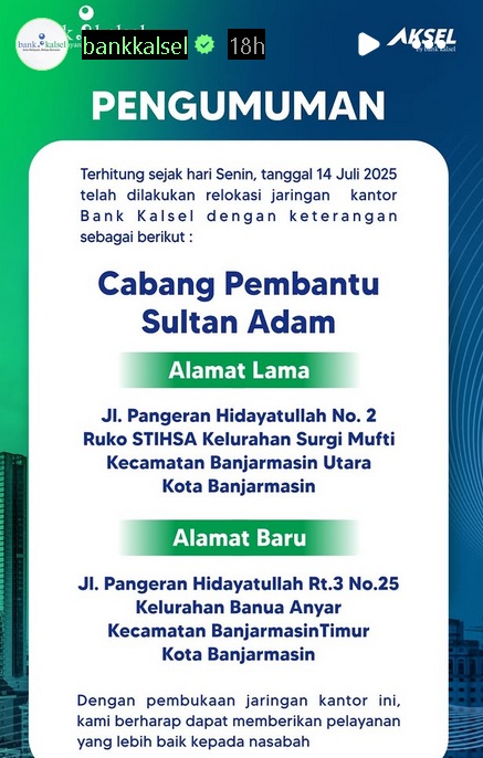 “Pemidahan tersebut karena adanya relokasi jaringan Bank Kalsel,” ujar pengumuman di Instagram Bank Kalsel, dikutip Selasa (15/7/2025).