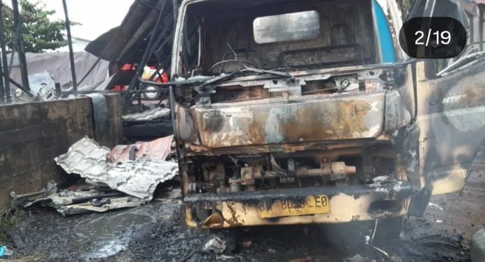 Api menghanguskan seluruh bangunan hingga kendaraan milik korban berupa satu truk dan dua sepeda motor.