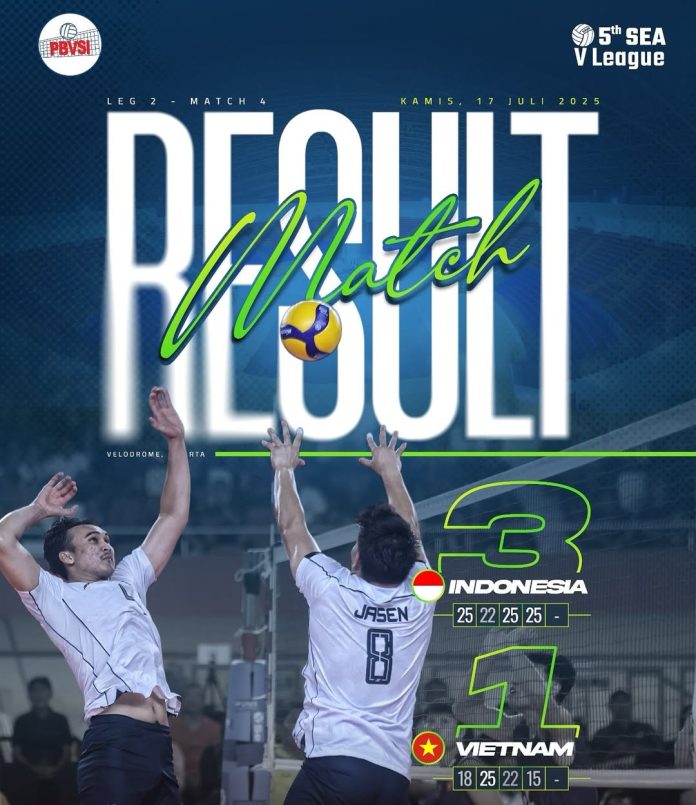 WARTABANJAR.COM, JAKARTA – Tim nasional bola voli putra Indonesia menunjukkan performa gemilang dengan mencetak kemenangan kedua di leg kedua SEA V League 2025. Bermain di hadapan pendukung sendiri di Jakarta International Velodrome, Kamis (17/7), Merah Putih menundukkan tim kuat Vietnam dengan skor meyakinkan 3-1 (25-18, 22-25, 25-22, 25-15).