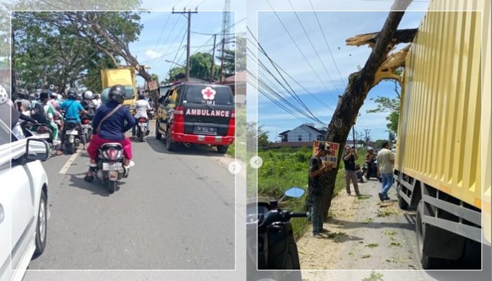 Video peristiwa itu viral setelah diunggah oleh akun Instagram @seputarbanua. Dalam video tersebut, terlihat sopir truk box terpaksa berhenti karena bagian atas kendaraannya tak bisa melintasi pohon yang melintang ke badan jalan.