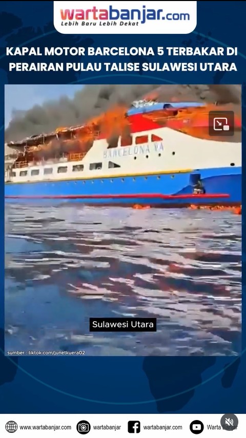 WARTABANJAR.COM – Kapal Motor (KM) Barcelona 5 terbakar saat berlayar dari Pelabuhan Melonguane, Kabupaten Kepulauan Talaud menuju Pelabuhan Manado, Minggu (20/7/2025). Kebakaran terjadi di sekitar perairan Pulau Talise, Kabupaten Minahasa Utara, Sulawesi Utara, sekitar pukul 12.00 hingga 13.00 Wita.