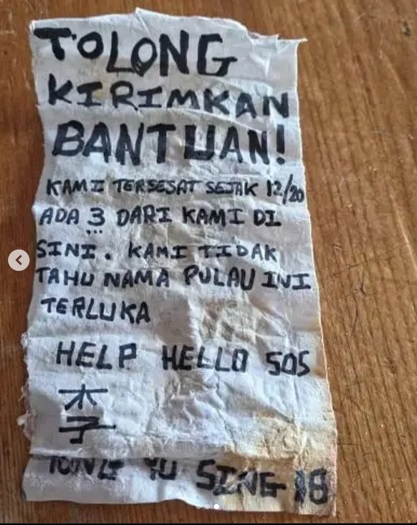 “Tolong kirim bantuan. Kami hilang sejak 20 Desember. Tiga orang dari kami di sini. Kami tidak tahu nama pulau ini, tetapi kami terluka. Tolong. Hello. SOS. Lee (李). Yong Yu Sing No.18.”