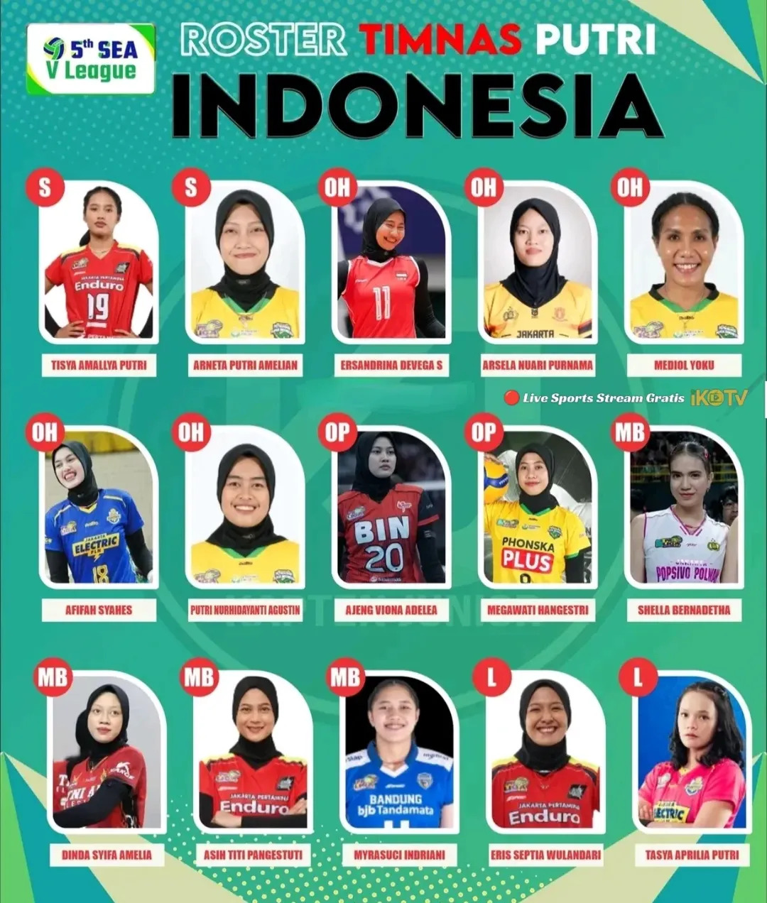 Sementara itu, Tisya Amallya Putri, sang setter utama, kembali dipercaya menjadi pengatur serangan. Akurasi umpan dan visinya yang tajam menjadikannya pusat kendali permainan tim. Di SEA V League 2025 ini, Tisya diharapkan mampu menjaga alur distribusi bola kepada para spiker dengan efisien, termasuk ke Megawati Hangestri dan Ajeng Viona.