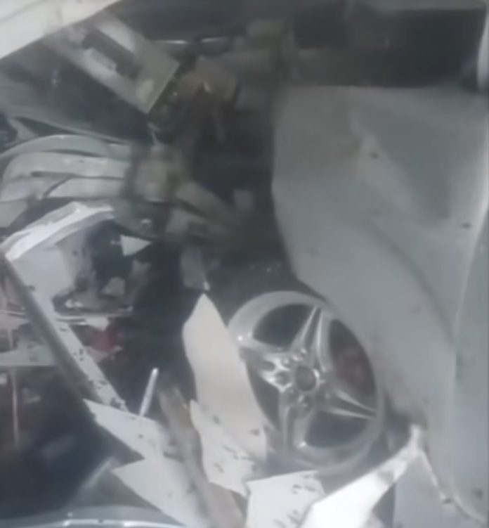 Bagian depan kap mobil juga ringsek. Tidak diketahui kondisi pengemudi mobil. Disebutkan kejadian terjadi pada subuh.