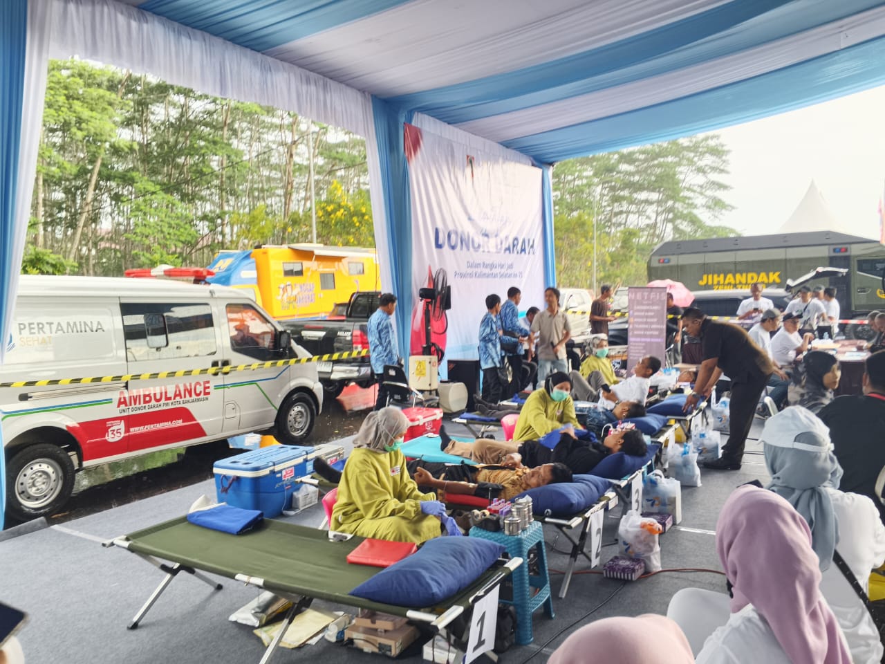 ”Saat ini memang di bawah target karena hujan dan sebagainya, tapi syukur alhamdullilah jumlah yang bisa kita terima hari ini mencapai 35 persen atau sekitar 53 pendonor,” ucap Ketua Pelaksana Donor Darah Bank Kalsel, Nordin, saat ditemui awak media.