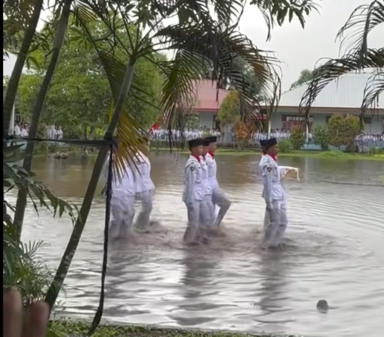 WARTABANJAR.COM – Viral sejumlah petugas Paskibraka melaksanakan upacara saat banjir menggenangi lapangan, Senin (18/8).