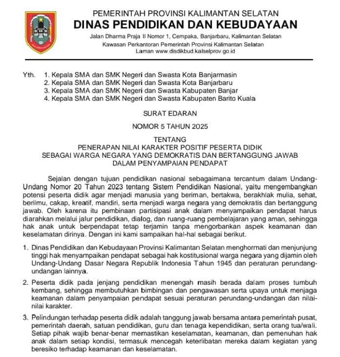 WARTABANJAR.COM – Surat Edaran Nomor 5 Tahun 2025 tentang Penerapan Nilai Karakter Positif Peserta Didik sebagai Warga Negara yang Demokratis dan Bertanggung Jawab dalam Penyampaian Pendapat diterbitkan Dinas Pendidikan dan Kebudayaan (Disdikbud) Provinsi Kalsel.