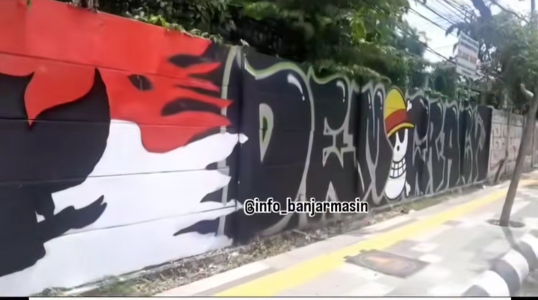 Mural bertuliskan RIP Democracy dengan lambang bendera kartun One Piece terlihat sejak kemarin, Minggu (31/8).