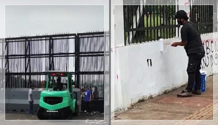WARTABANJAR.COM, JAKARTA – Perbaikan pagar besi Gedung DPR RI yang rusak akibat aksi demonstrasi, Minggu (31/8/2025), menuai sorotan publik. Sejumlah teknisi langsung diterjunkan, memperbaiki pagar menggunakan mesin las, gerinda, palu, hingga kayu untuk menopang bagian yang patah.