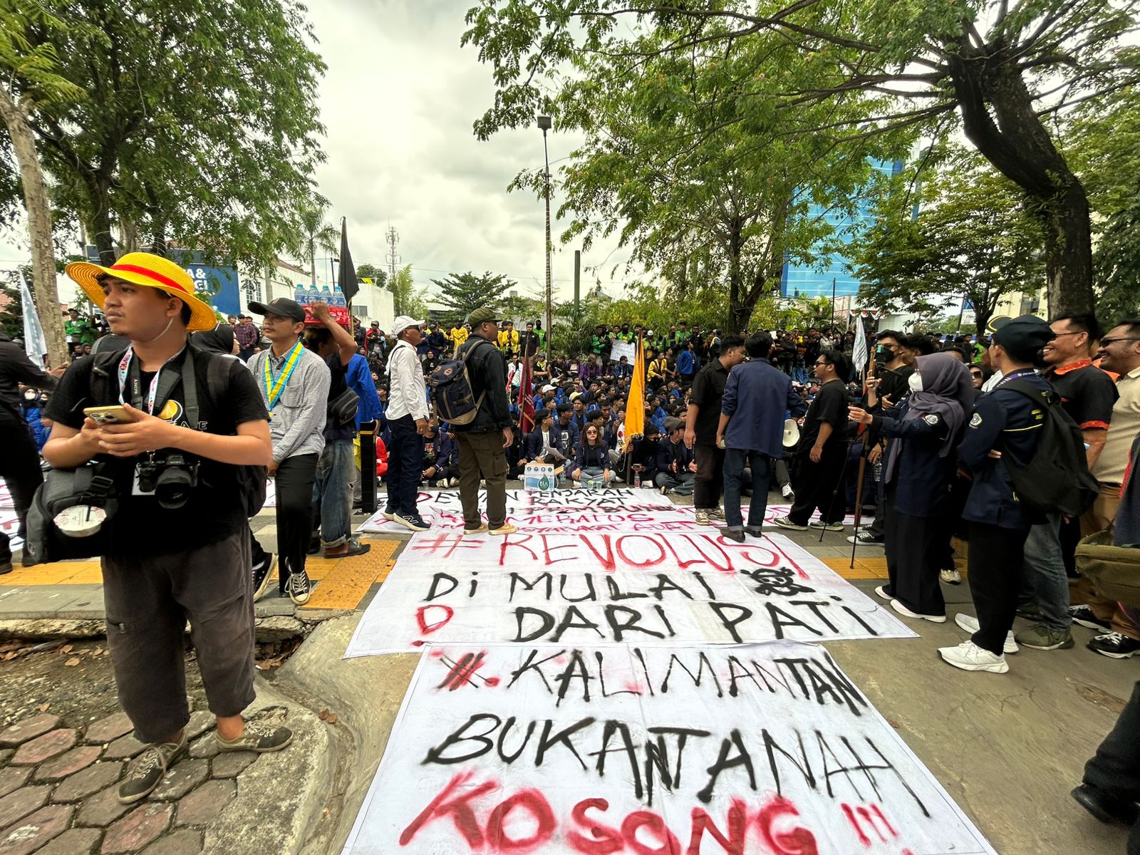 Pantauan di lapangan, terlihat ribuan massa yang terdiri dari mahasiswa, komunitas, hingga sopir ojek online (Ojol) yang tergabung dalam Aliansi Kalsel Bersatu memenuhi jalan di depan Kantor DPRD Kalsel, dengan membawa spanduk, bendera, serta atribut Unras.