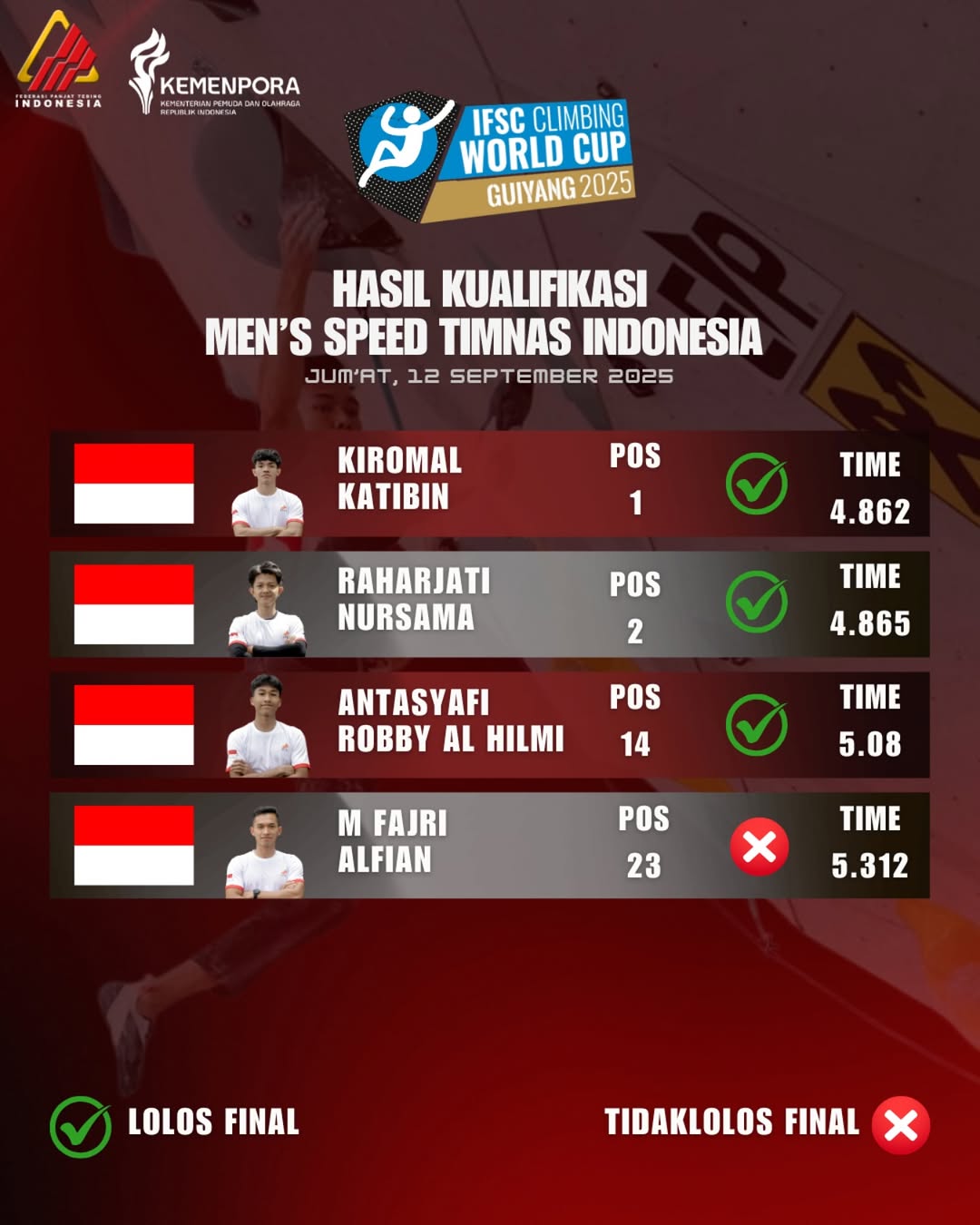 Ketiganya tampil impresif pada babak kualifikasi yang berlangsung di Guiyang International Climbing Center, China. Kiromal bahkan mencatatkan diri sebagai yang tercepat dengan torehan waktu luar biasa 4,862 detik, menempatkannya di peringkat pertama.