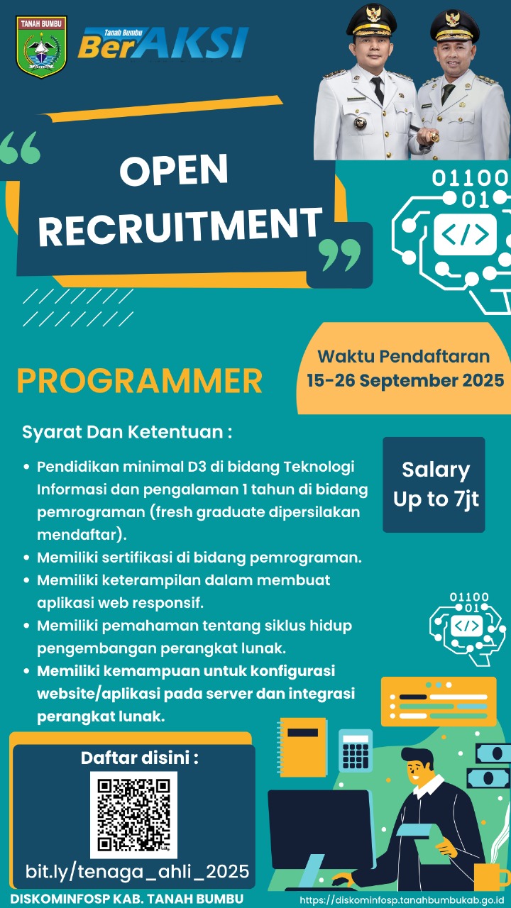 WARTABANJAR.COM, BATULICIN – Dinas Komunikasi Informatika Statistik dan Persandian (Diskominfo SP) Kabupaten Tanah Bumbu membuka rekrutmen terbuka untuk tiga posisi strategis: Programmer, Administrator Sistem, dan Teknisi Jaringan.
