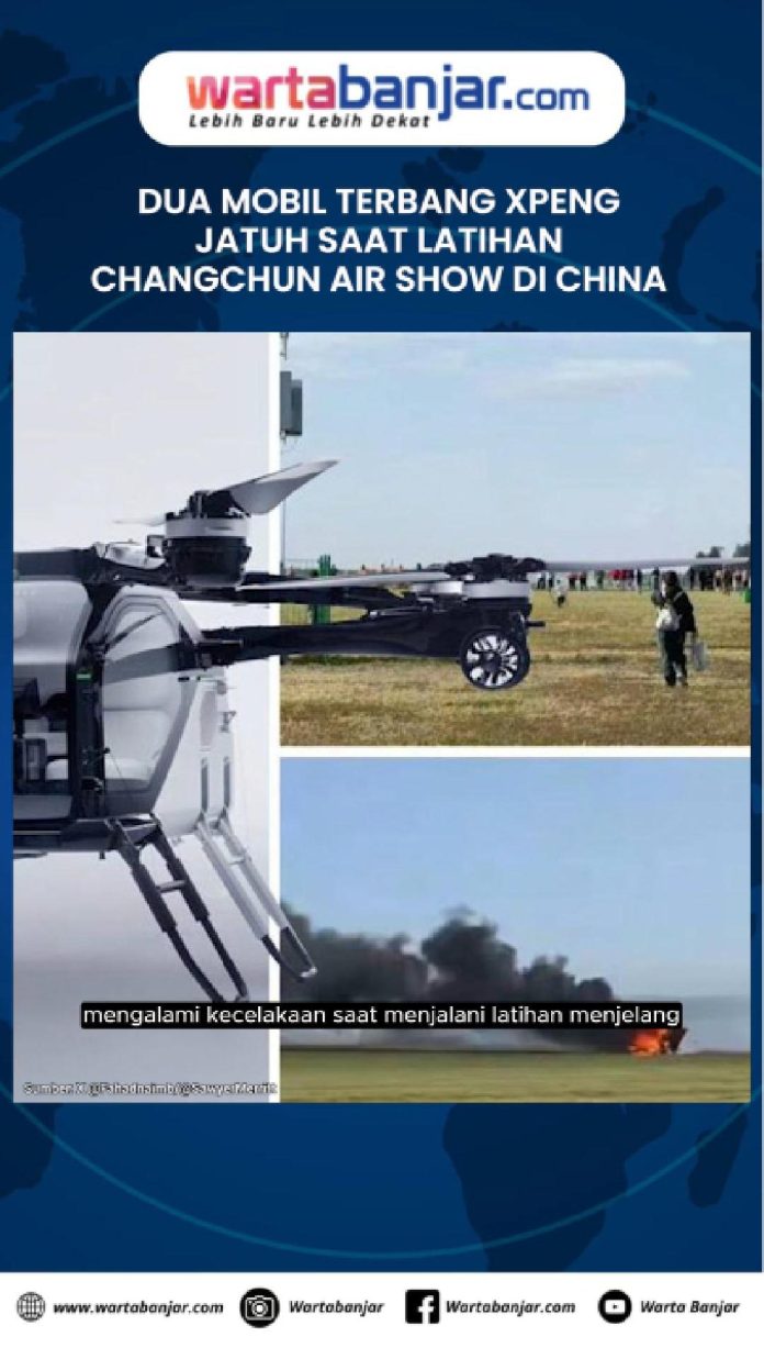 WARTABANJAR.COM, BEIJING – Dua unit mobil terbang atau electric vertical take-off and landing (eVTOL) milik Xpeng Aeroht mengalami kecelakaan saat menjalani latihan menjelang Changchun Air Show 2025 di China, Jumat (19/9/2025).