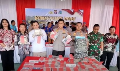 Konferensi pers dipimpin Kapolres Lamandau AKBP Joko Handono bersama Kapolda Kalteng Irjen Iwan Kurniawan. Dari tangan pelaku, aparat menemukan 44 bungkus besar sabu yang disembunyikan di dalam tiga ransel di mobil tersangka.