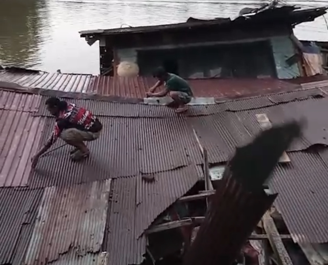 Beberapa pria mencoba membongkar atap rumah untuk mengambil berbagai perabotan yang bisa diselamatkan.