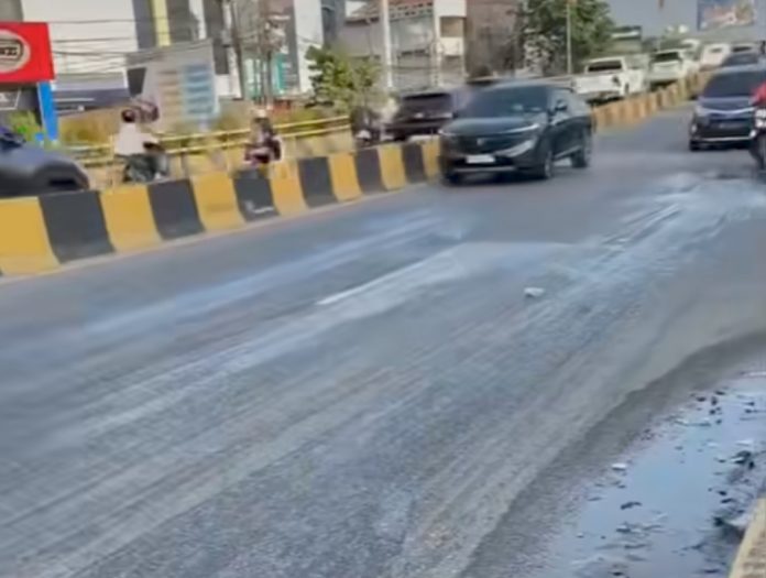 Terlihat tumpahan minyak menyebar di tengah dan tepi jalan. Pengendara pun memperlambat laju kendaraan.