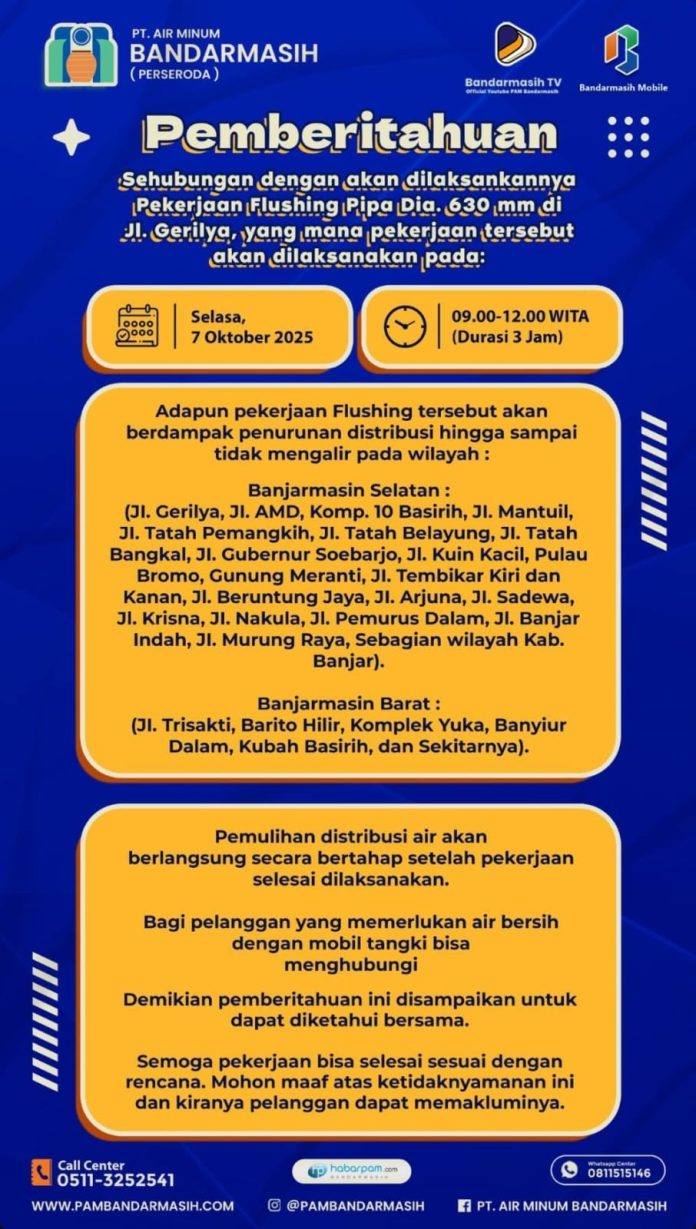 Pekerjaan flushing tersebut akan dilaksanakan besok, Selasa (7/10/2025) selama 3 jam mulai pukul 09.00 Wita hingga 12.00 Wita.