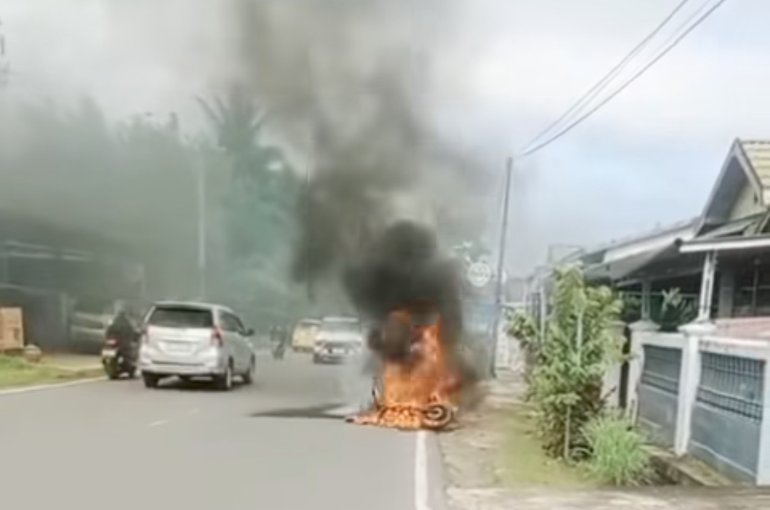 Sepeda motor terbakar di jalan raya saat kendaraan lalu lalang. Para pengendara terlihat menghindar.