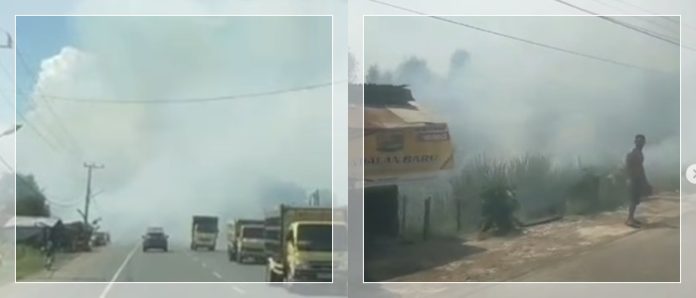 Dalam video berdurasi singkat itu, tampak lidah api berkobar di kiri-kanan jalan utama, membakar semak dan pepohonan kering di sekitar area hutan. Asap tebal mengepul hingga menutupi sebagian badan jalan, membuat pengguna jalan kesulitan melintas dan menimbulkan kepanikan warga sekitar.