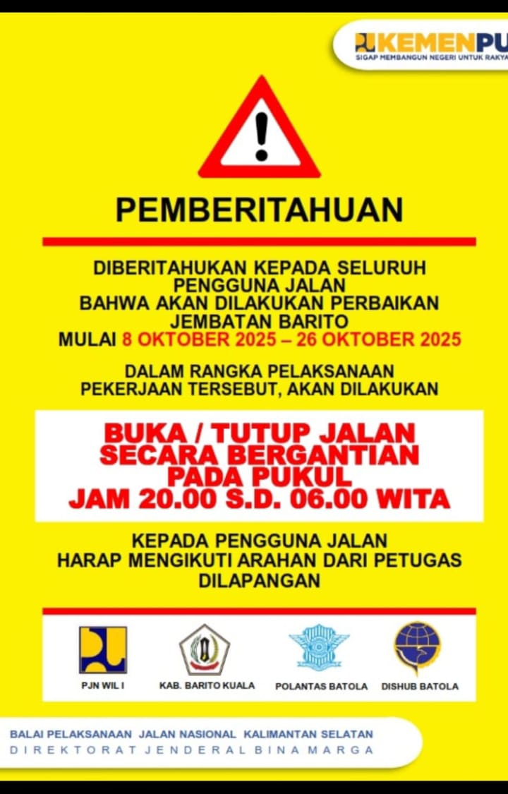 Pengerjaan perbaikan Jembatan Barito ini akan dilaksanakan hingga 26 Oktober 2025 atau selama 18 hari.