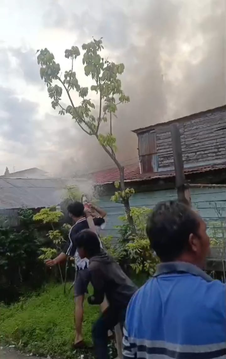 Warga sekitar tampak ramai di sekitar lokasi kebakaran, bahkan beberapa tampak membantu menyiram air guna memadamkan api.